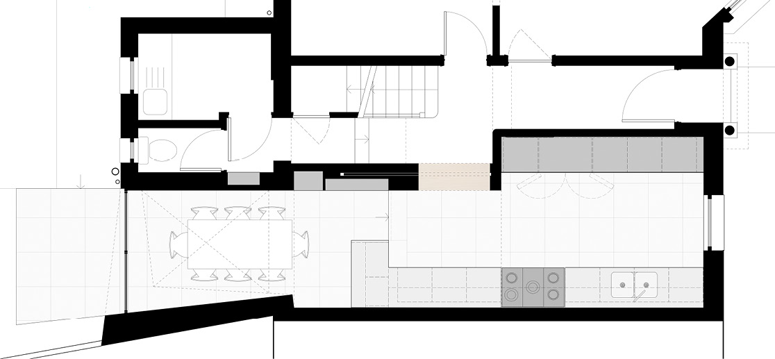 A new 30sqm kitchen and dining room was created by combining two of the existing rooms with a new rear extension.