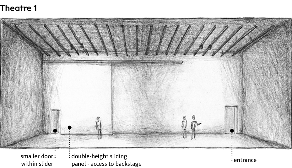 As adaptable spaces, the theatres' only permanent features are the lighting rails and the large sliding doors, which allow large pieces to be brought in from the backstage area.