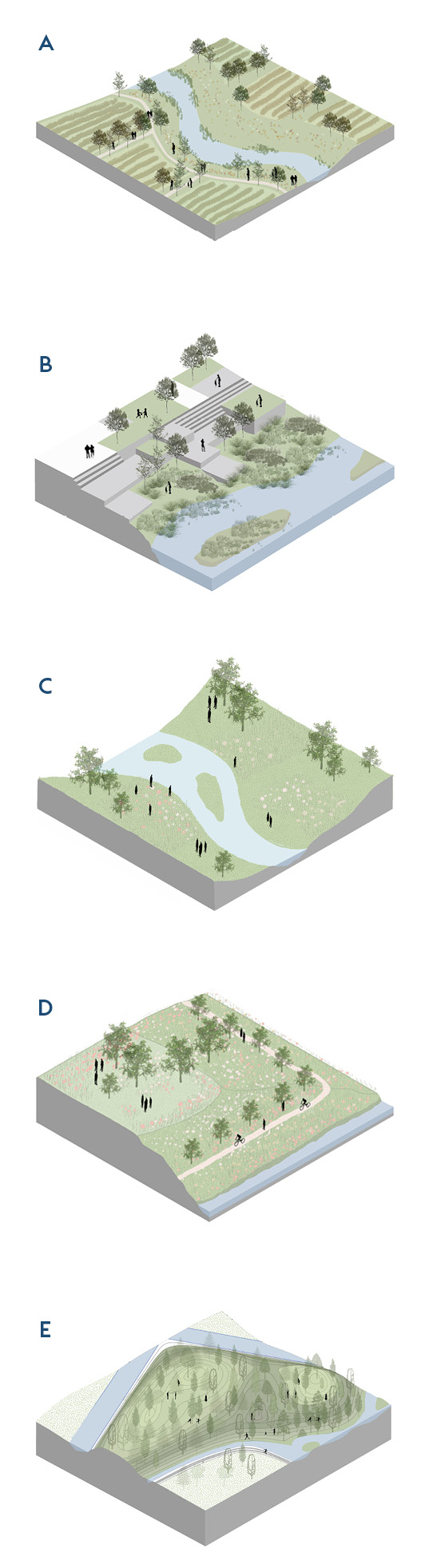 Topography is manipulated to reinforce this concept. Excavated material from the waterway is used to enlarge an existing hill at one end of the site, originally formed from construction rubble. A dialogue between natural and urban geometries defines the character of the spaces.