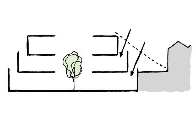 Opportunity from constraints: the building steps back between every level, to allow for sky-lighting, and to avoid overshadowing the neighbours.